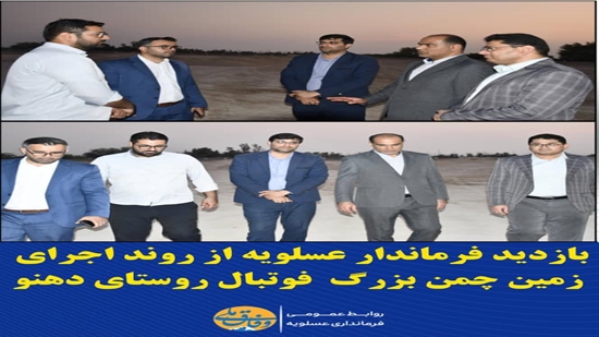 ����غروب امروز دکتر پاسالار فرماندار شهرستان عسلویه به همراه معاون سیاسی، معاون عمرانی و بخشدار مرکزی با حضور در روستای دهنو از نزدیک در جریان اجرای زمین چمن بزرگ فوتبال این روستا قرار گرفت ����دکتر پاسالار در این بازدید اظهار داشت؛ کلنگ این زمین فوتبال در هفته دولت به زمین زده شد و با توجه به پیشرفت خوب پروژه ان شاء الله در دهه فجر به بهره‌برداری خواهد رسید و روستای دهنو صاحب زمین چمن بزرگ فوتبال خواهد شد/روابط عمومی فرمانداری عسلویه